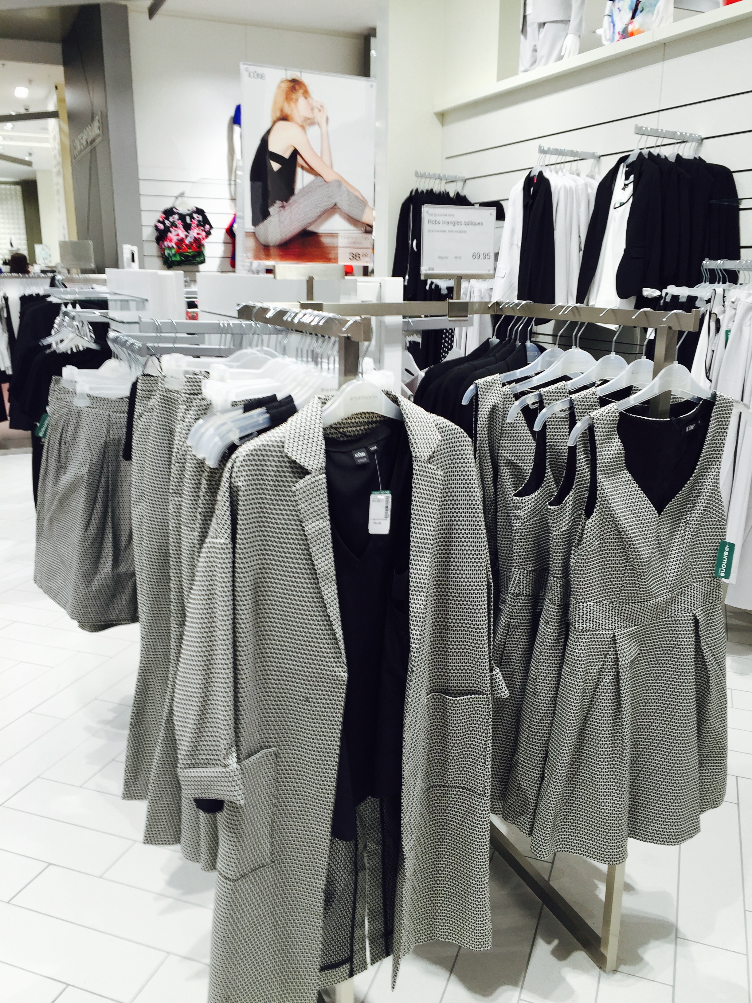 While sashaying through all the racks and displays on the women’s side it was abundantly clear that there were some fabulous pieces to create an entire wardrobe module or purchase a few pieces to incorporate into an existing wardrobe. What caught my attention immediately were the pieces in the Contemporaine line, which Simons describes as elegant, professional and dynamic. The colour story was done in heather grey and classic black ; however there were several other colours available (solids and prints) and style options from other lines and departments.